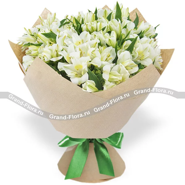 Стандартный: альстромерия белая - 11 шт., декоративная зелень., упаковка, лента.